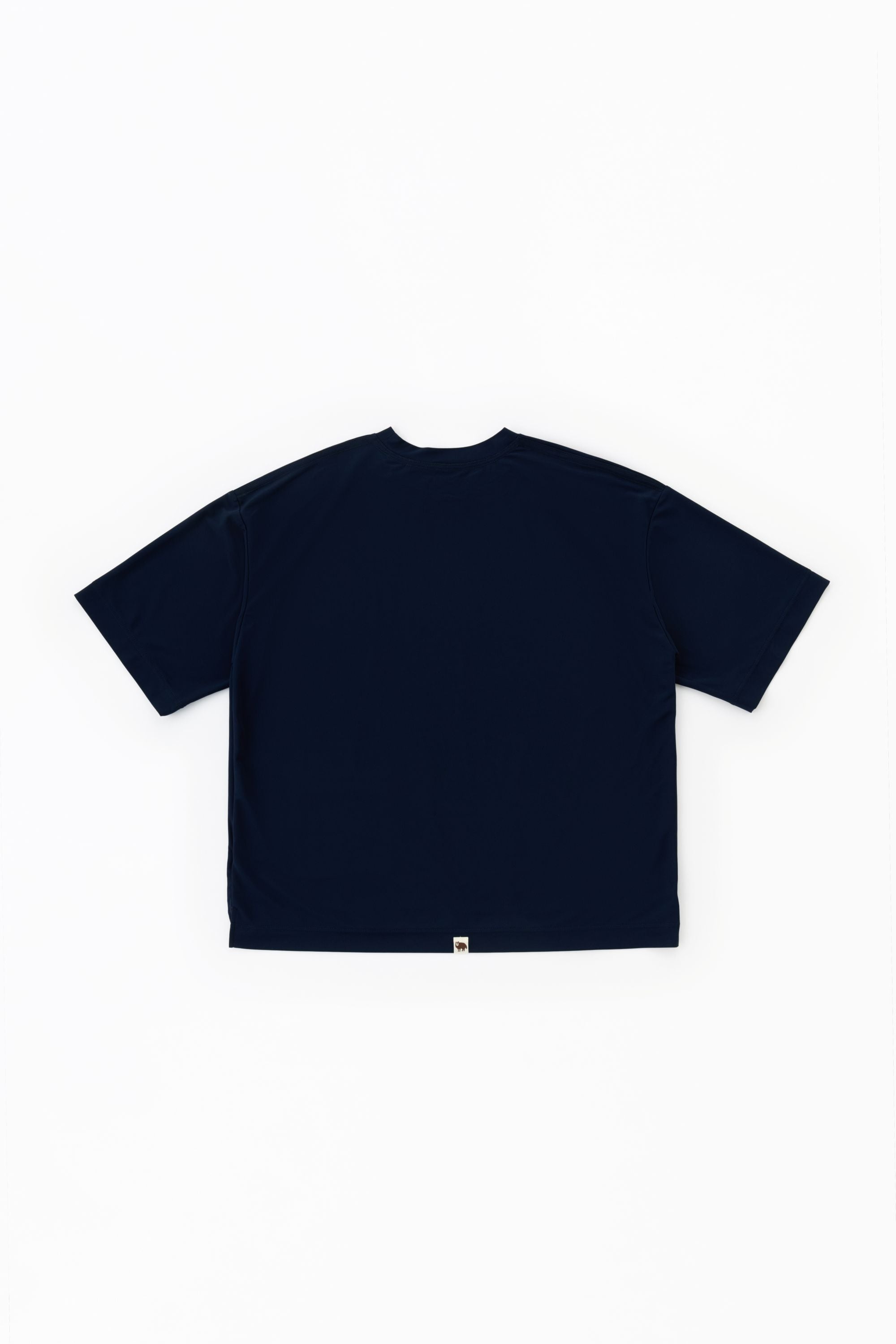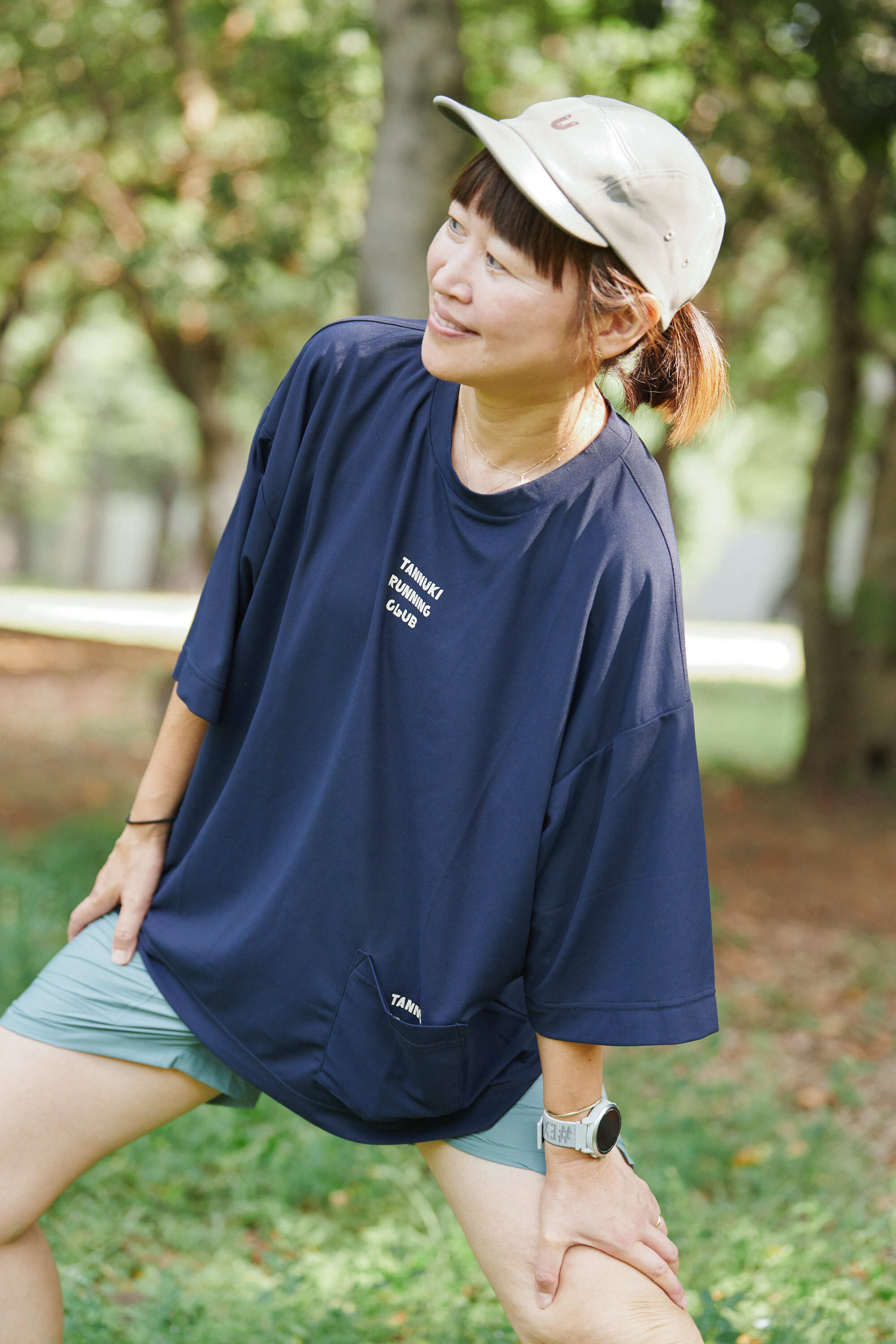 ゆったりとしたビッグシルエットTシャツです。少し大きめ、というわけではなくしっかりとビッグシルエットなTシャツになっています。見た目はほっこりと丸みあるかわいらしさもある感じです。日常着として着てもらって、そのまま走りだしてほしいです。ポケットが左裾に付いています(ポケットの内側にはサイズ表記を兼ねたタヌキが潜んでいます)。