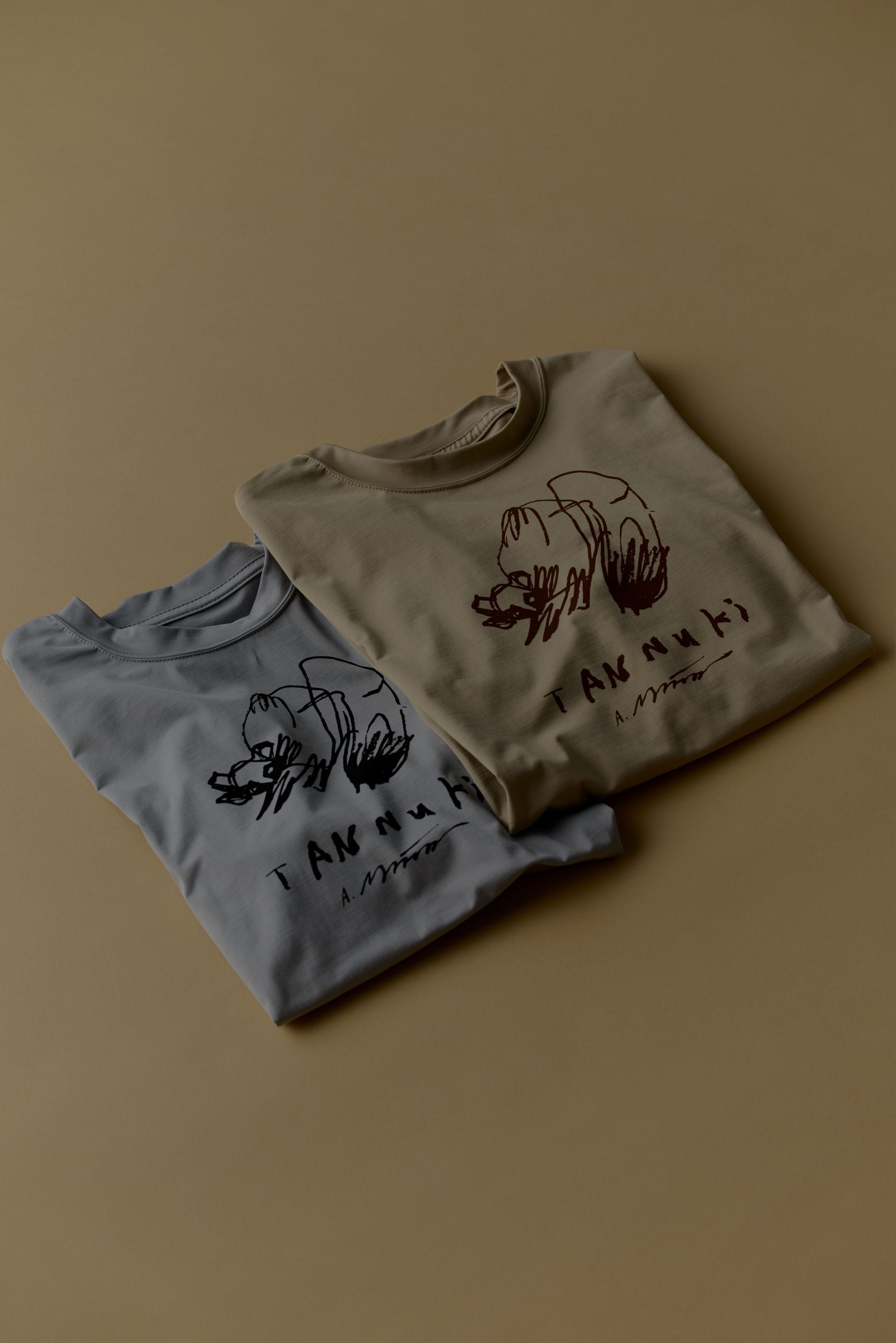 アルマンドさんのグラフィックを前面に配置しました。オリジナルのタヌキモチーフにTANNUKIの文字、そして作家のサインを一体化してグラフィックとしています。写真にもありますがグラフィックを描いてもらうにあたってはいくつかの習作を描いてくれています。その習作の段階からとても素敵な作品になっているのがわかります。ランナーでありアーチストである彼の作品をぜひ楽しんでいただければと思います。