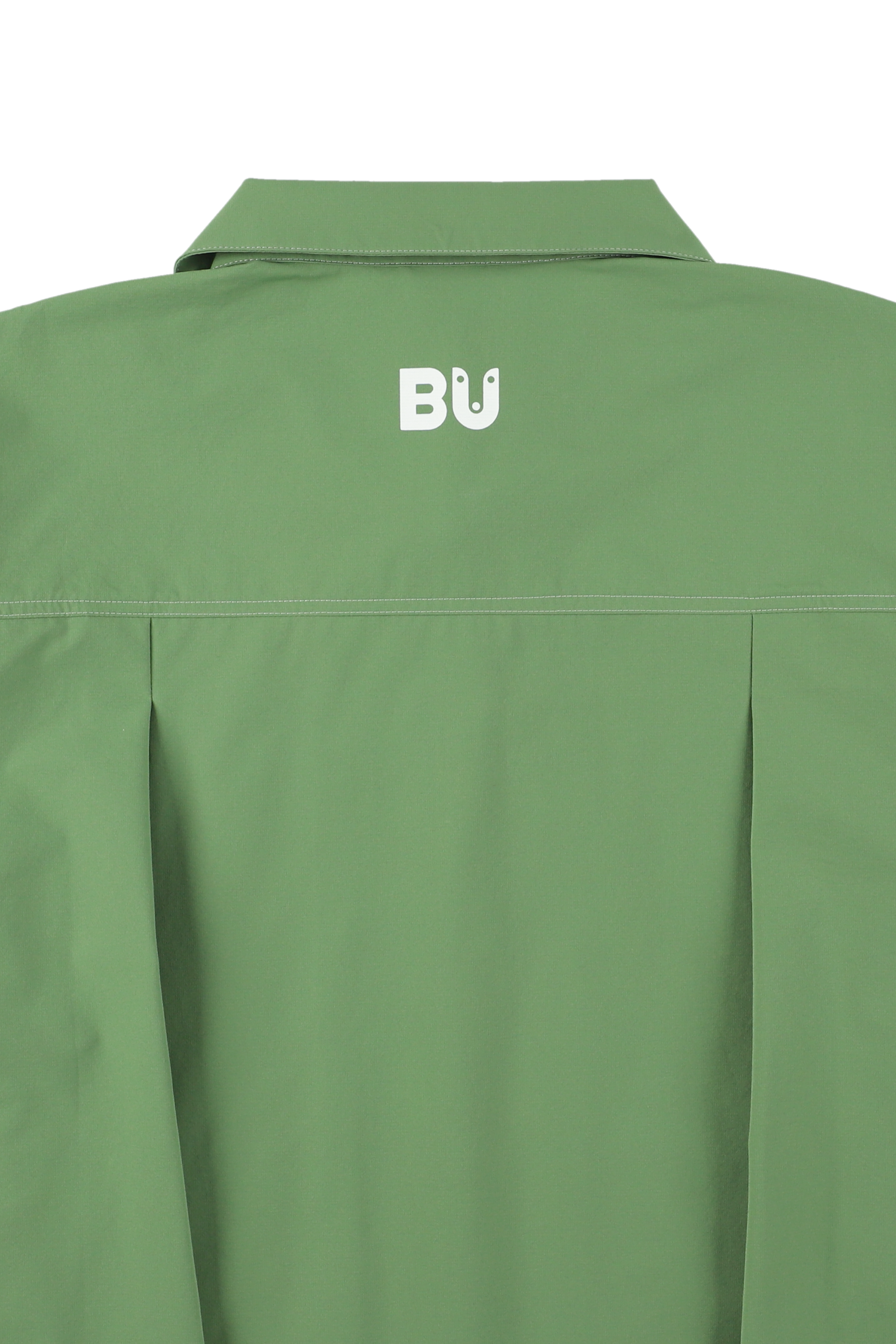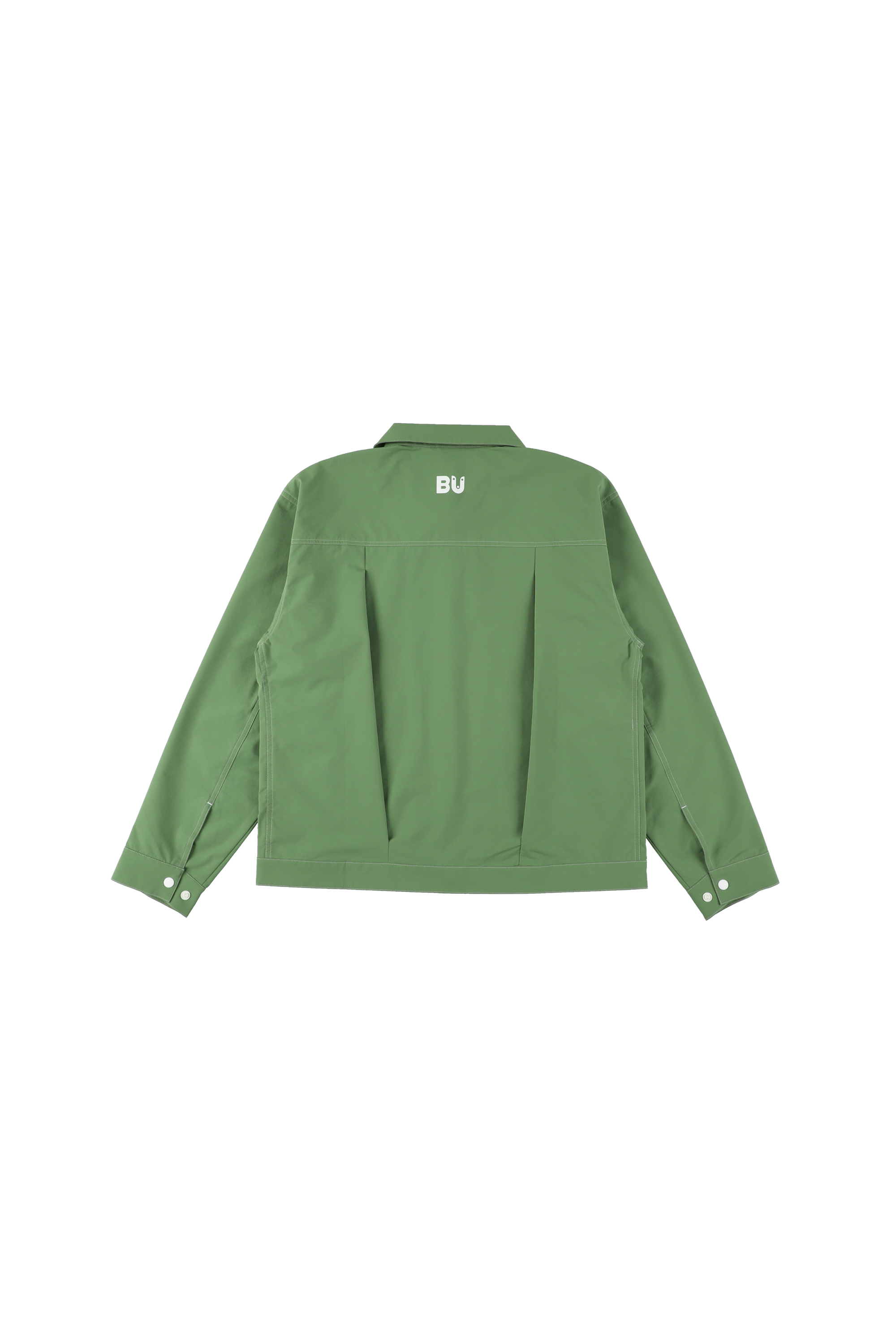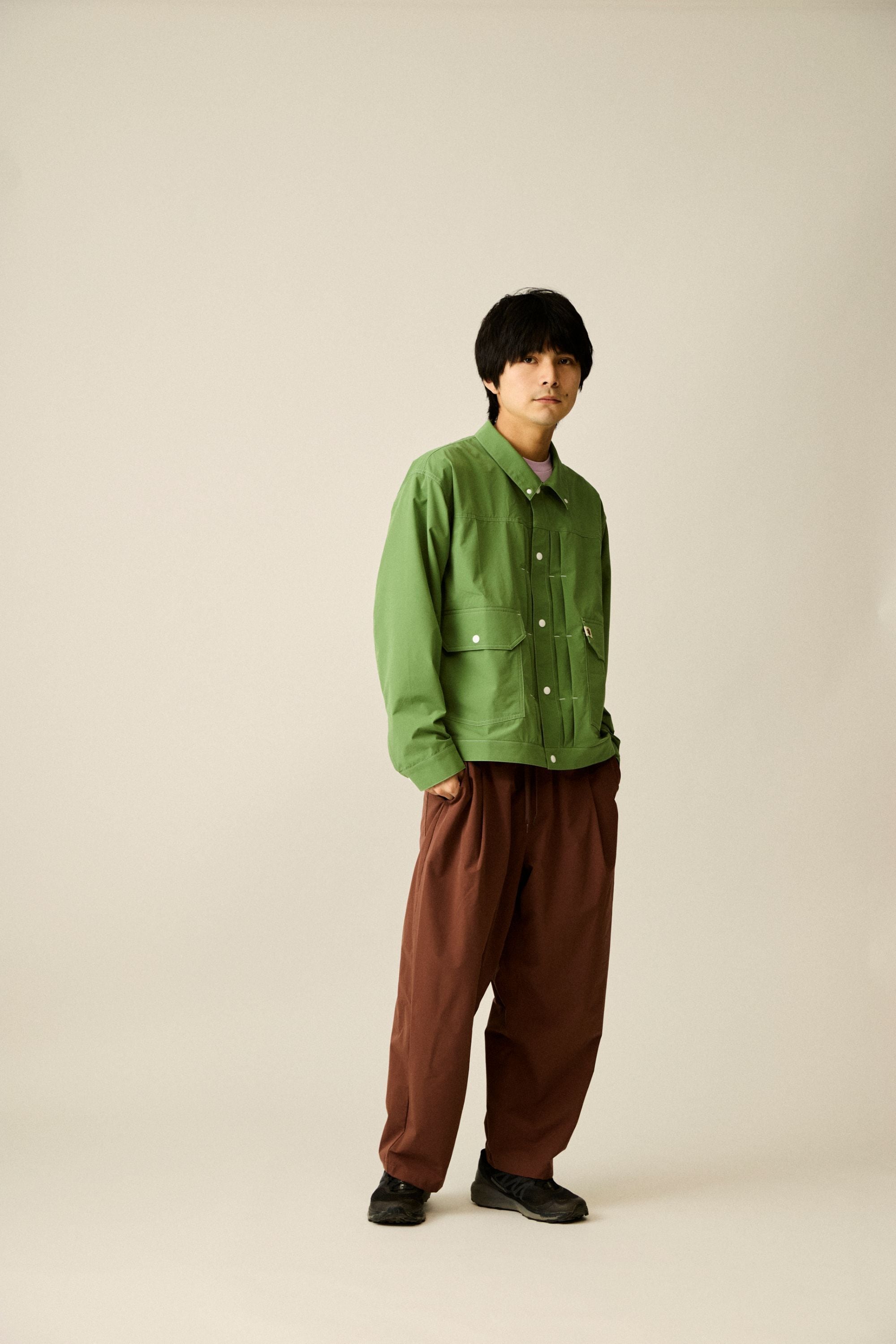 It features a comfortable fit and a shorter length. The front stitching and pleated design are key design points. Large pockets are placed on both sides, allowing access from both the top and the side. The front features snap closures that function as ventilation. There are also snaps on the collar tips to keep the collar in place when it's turned up. Tucks are added to the back to increase range of motion, and depending on the shape, it can even be worn over a running backpack. The material is made of polyester based on molecules with a helical structure, achieving a balance of both stretchability and lightness. Contrary to its substantial appearance, it is surprisingly lightweight. In addition, it possesses the inherent characteristics of polyester, such as ease of handling and quick-drying properties. Furthermore, it is also treated with water-repellent and UV protection functions.