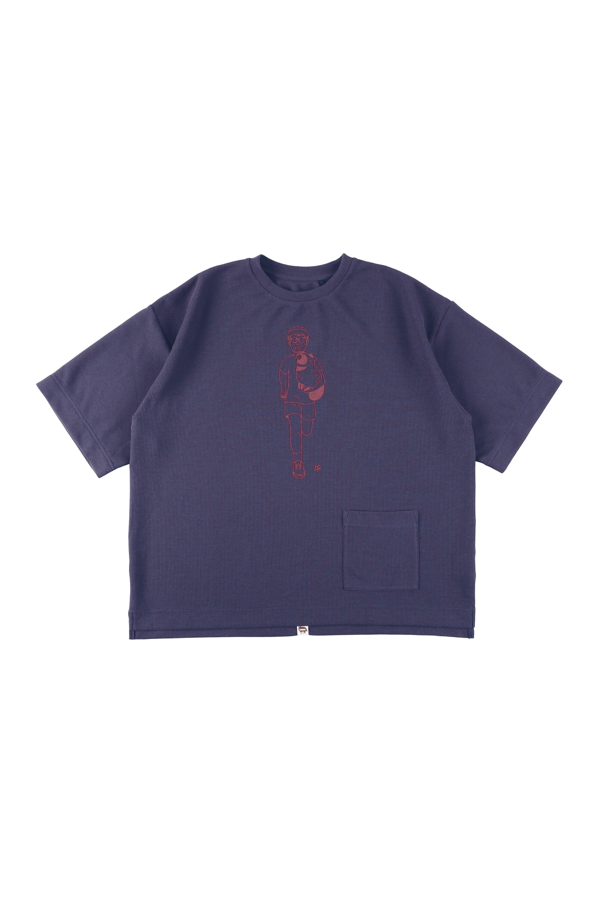 シルエットは、少し大きめ、というわけではなくしっかりとビッグシルエットなTシャツになっています。見た目はほっこりと丸みあるかわいらしさもある感じです。日常着として着てもらって、そのまま走りだしてほしいです。ポケットが左裾に付いています(ポケットの内側にはサイズ表記を兼ねたタヌキが潜んでいます)。
