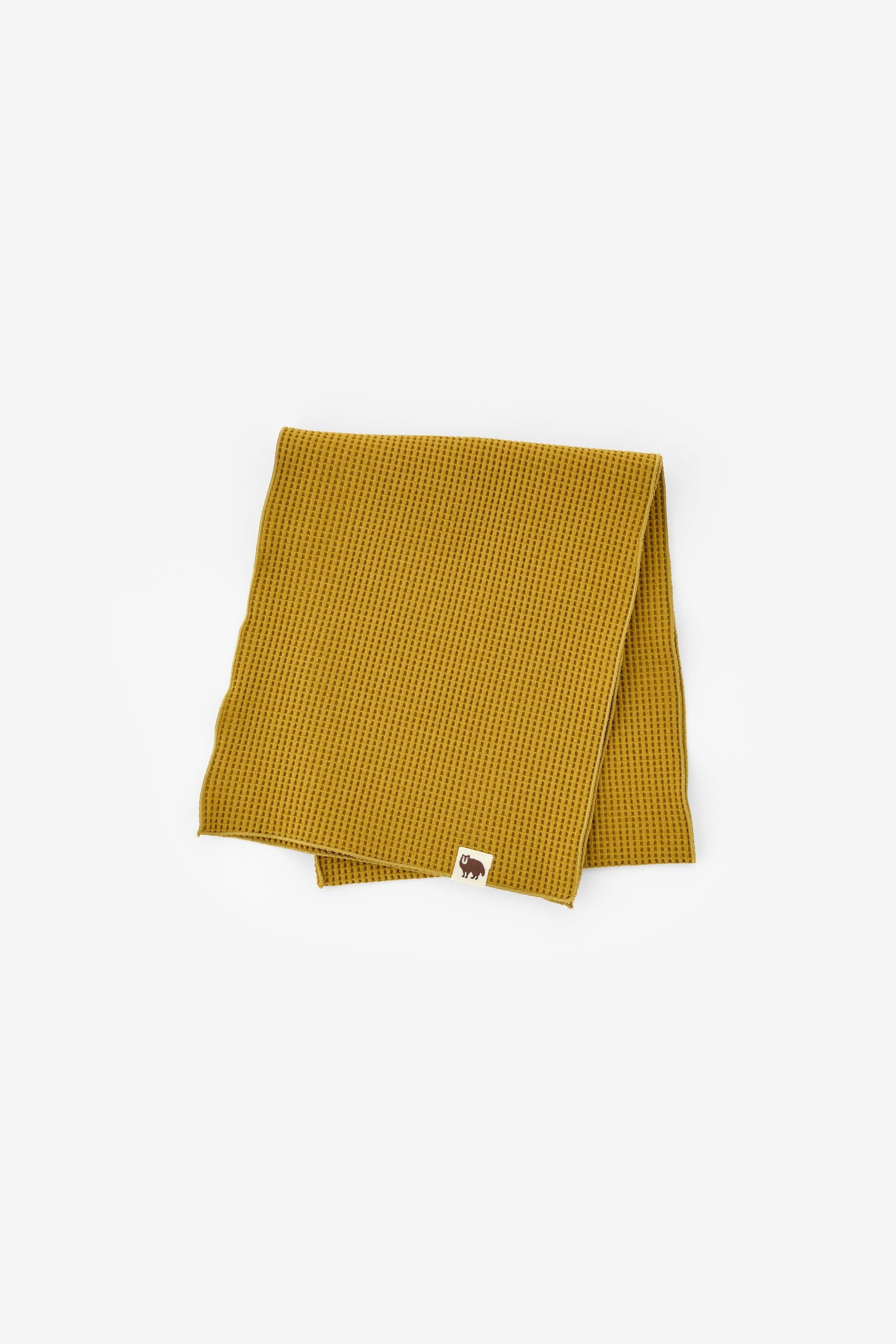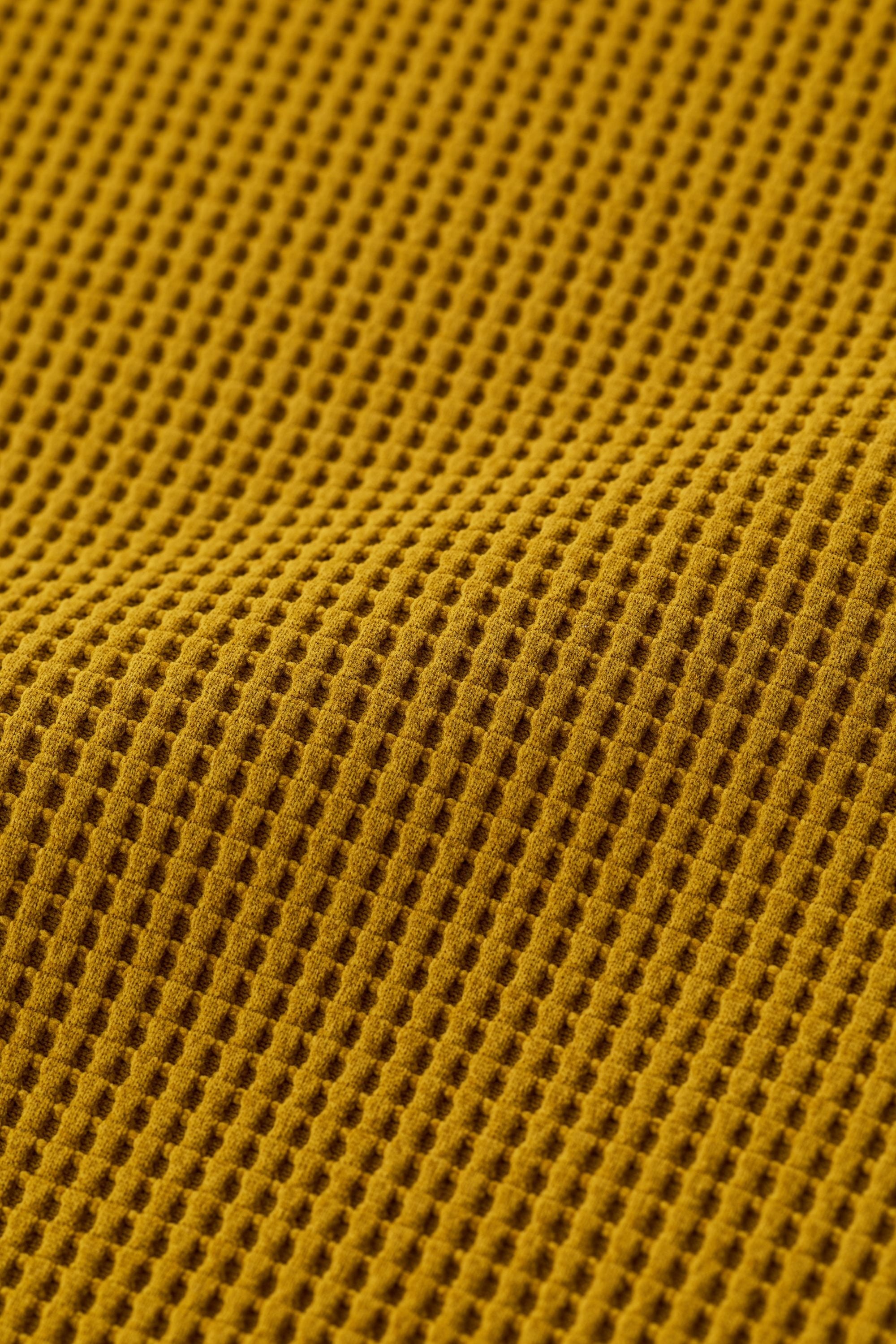 ワッフル素材の名前の由来はお菓子のワッフルから。ワッフルのように表面にマス目状の凹凸感のあるのが特徴です。凸凹によって肌にあたる面積が小さくなることでさらっとドライに使っていただけます。タオルやシーツなんかにワッフル素材が多く使われてきたのもその肌当たりの良さからです。構造上の利点が色々とありまして、糸と糸との間に空間があることから、吸水性、通気性、柔軟性に優れます。