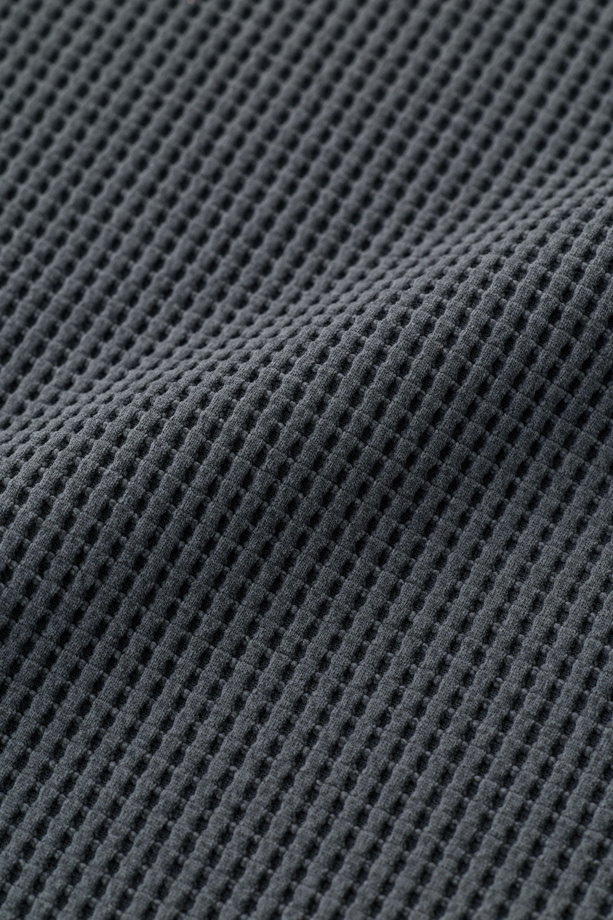It's characterized by a grid-like, textured surface. This texture reduces the surface area in contact with the skin, resulting in a dry and comfortable feel. Waffle material has long been used in towels and sheets due to its pleasant feel against the skin. Its structural advantages include excellent water absorption, breathability, and flexibility due to the spaces between the threads.