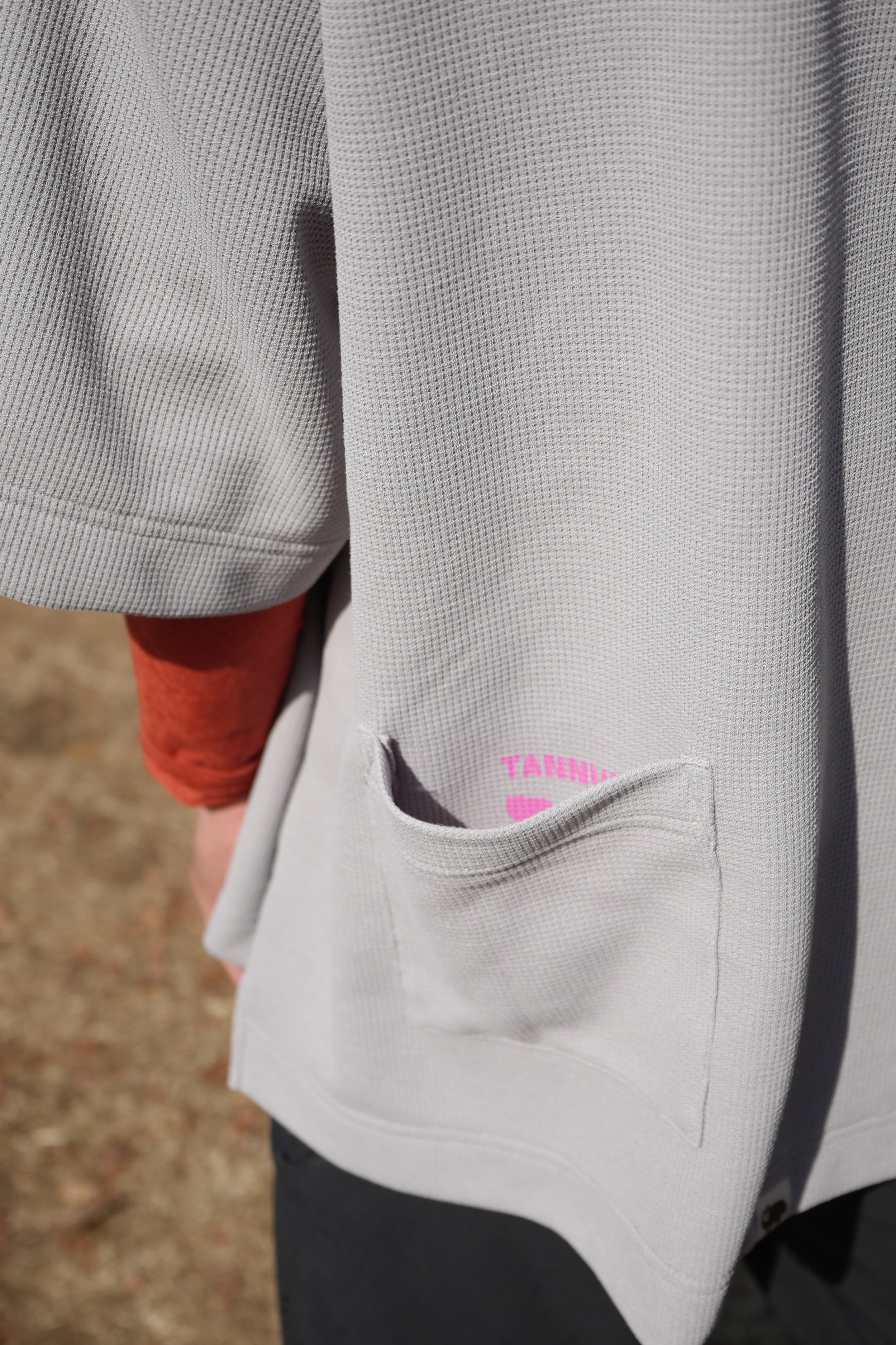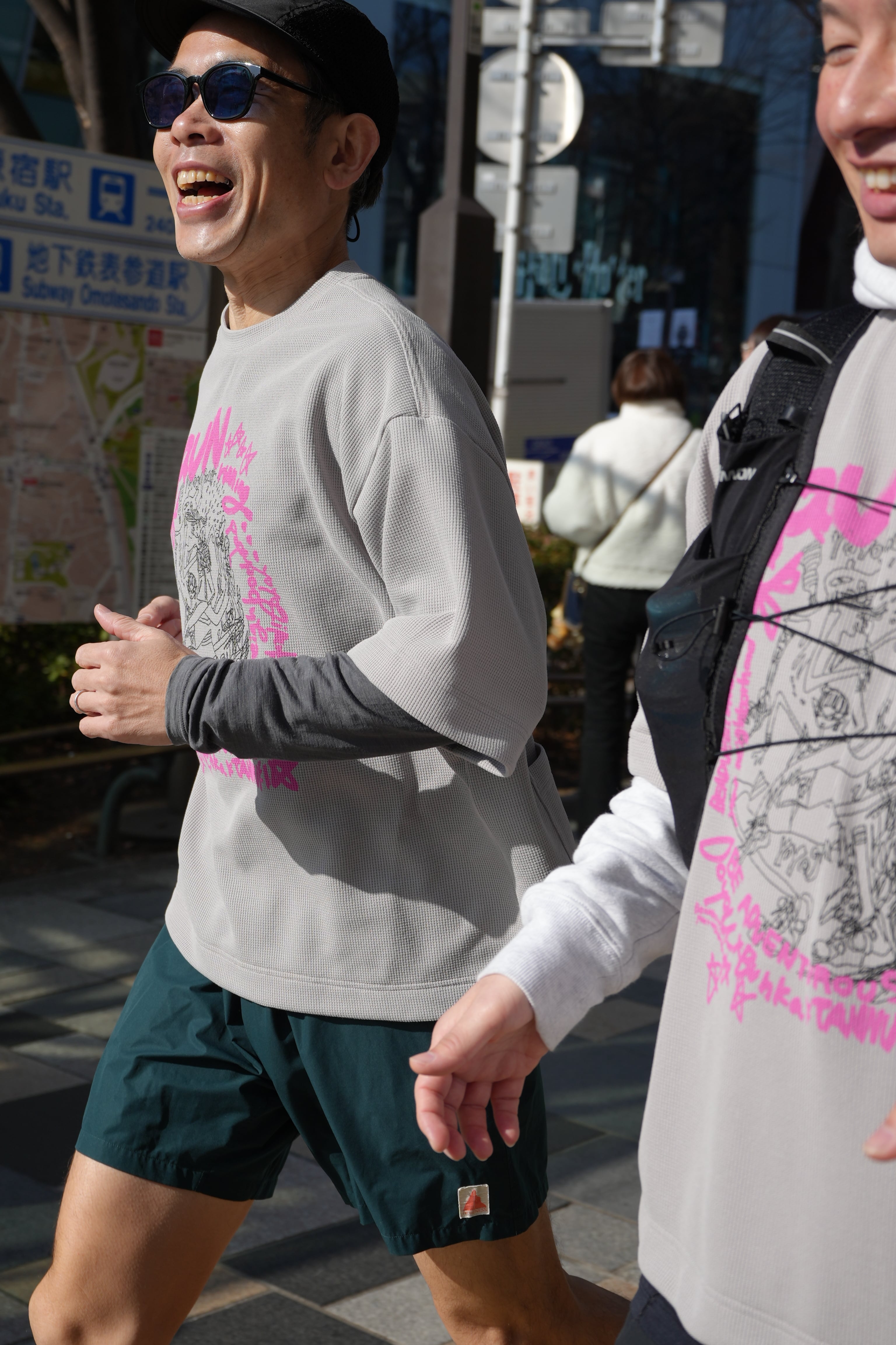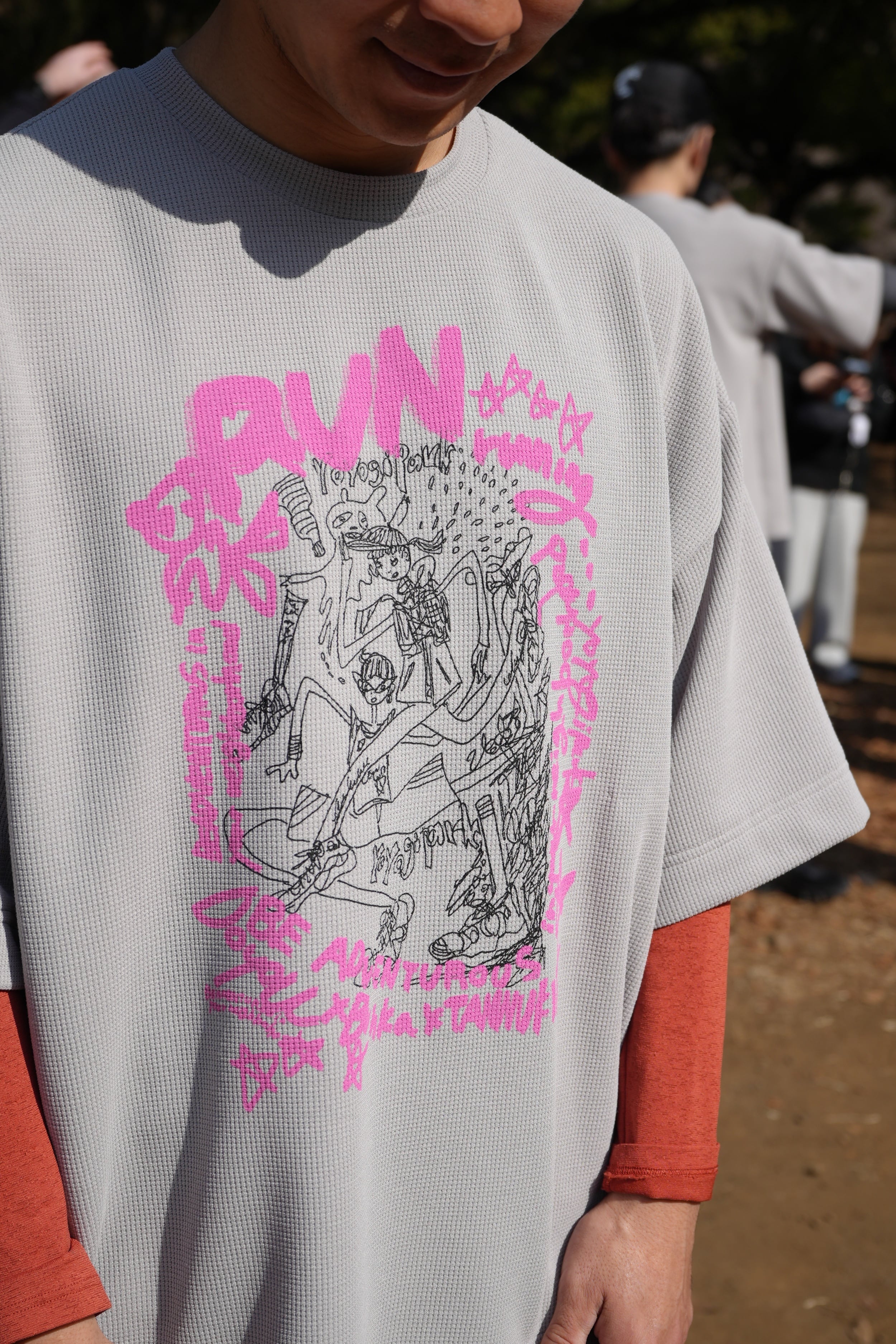 ボディはTANNUKIアイテムのなかでも人気の高いワッフル素材のビッグシルエットデザインです。風を感じながらゆったりとした気持ちで走ることが出来て、コラボレーションメンバーの雰囲気ともフィットします。また、今回はこれまでにない大きさの大型グラフィックをフロント面に配置していることもあり、ポケットを通常の左前ではなく左後ろに配置しました。デザインのキーとなるグラフィックはBRCのメンバーで独創的なイラストを描くヒナエさんによるものです。中央にはランナー達が表現され(愉快な感じのタヌキもいます)、更に3者のロゴに加えて、DOYOUが大切にしている言葉「BE ADVENTUROUS in your neighborhood(日常の中で冒険心を持とう)」をアレンジしてデザイン化しています。