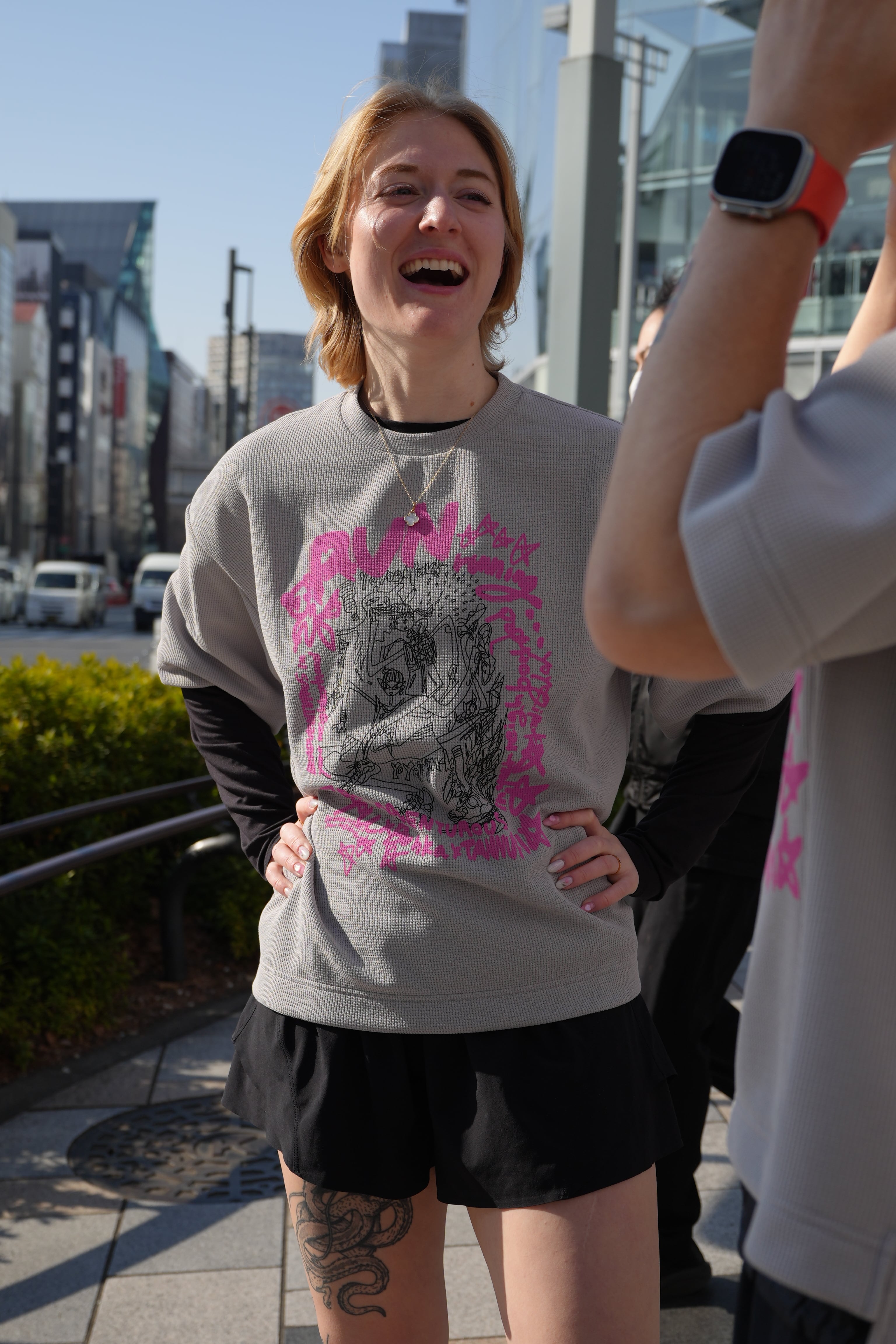 The big silhouette T with waffle fabric, a popular material among TANNUKI items. It allows you to run comfortably while feeling the breeze and fits the mood of the collaboration members. Additionally, due to the extremely large graphic on the front, the pocket was placed on the back left instead of the usual front left. The key graphic of the design was created by Hinae, a BRC member and creative illustrator. Runners are depicted in the center (including a playful raccoon), and the design features the logos of the three brands and an arrangement of DOYOU's slogan, "BE ADVENTUROUS in your neighborhood."