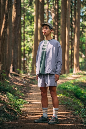 素材は今回新たに採用した、(見た目にはわかりませんが)繊維がバネ形状となっているポリエステル100%素材です。一番の特徴は、軽さとストレッチ性の両立にあります。とても軽い着心地で、かつしっかりとストレッチし動きやすさを発揮します。また撥水加工が施されており、汚れもつきにくく、小雨なんかはしっかりと弾きます。一方で風合いには、コットンを思わせるナチュラルさがあり、山にも街にもスッと馴染みます。